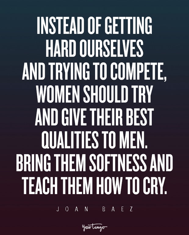 "Instead of getting hard ourselves and trying to compete, women should try and give their best qualities to men - bring them softness and teach them how to cry." — Joan Baez