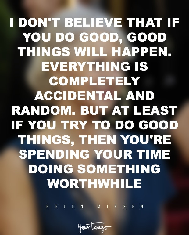 "I don't believe that if you do good, good things will happen. Everything is completely accidental and random. Sometimes bad things happen to very good people and sometimes good things happen to bad people. But at least if you try to do good things, then you're spending your time doing something worthwhile." — Helen Mirren