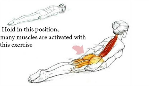 Lie down on your stomach with your face down toward the floor. Slowly and gingerly life the front part of your body, with your head up. Lift as high as is comfortable; don't push it too hard.