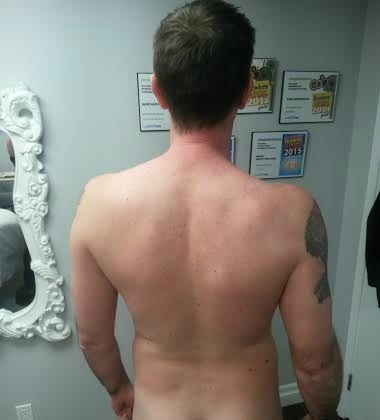 Monica took a look at what her task was and had me lie face down on the table, shirtless. I have a patch of hair just above where my belt sits on my waist and was informed that it would go as well, only my pants were buckled up nice and snug so I had to lose the pants so she could get at it. Not wanting to look totally ridiculous, I lost the socks, too.