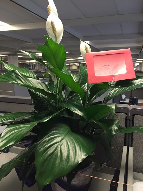 They got her a beautiful lily with a "Welcome, Zoe!" card: