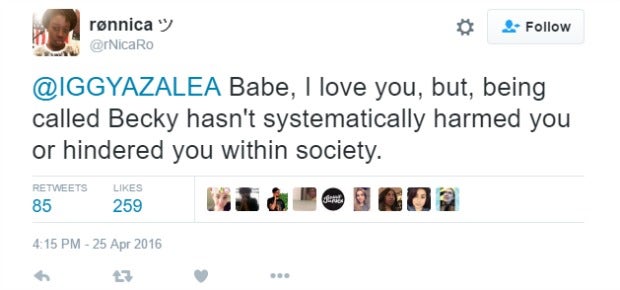 To the woman who smacked back at Iggy by saying "Babe, I love you, but being called Becky hasn't systematically harmed you or hindered you within society," however ...