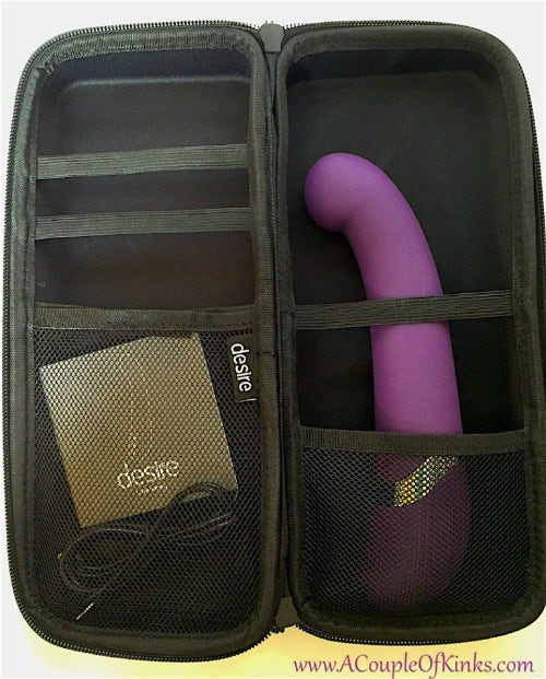 The box itself is sleek and almost true-to-size, with the image only slightly smaller than the real thing. The LH Desire G-Spot Vibrator comes with a lockable carrying case, a USB charging cord and an instruction manual. The carrying case is classically simple and only recognizable if you know the Lovehoney logo. It is a fairly large package so it would take up space in your baggage, but there is enough room for some extra toys.