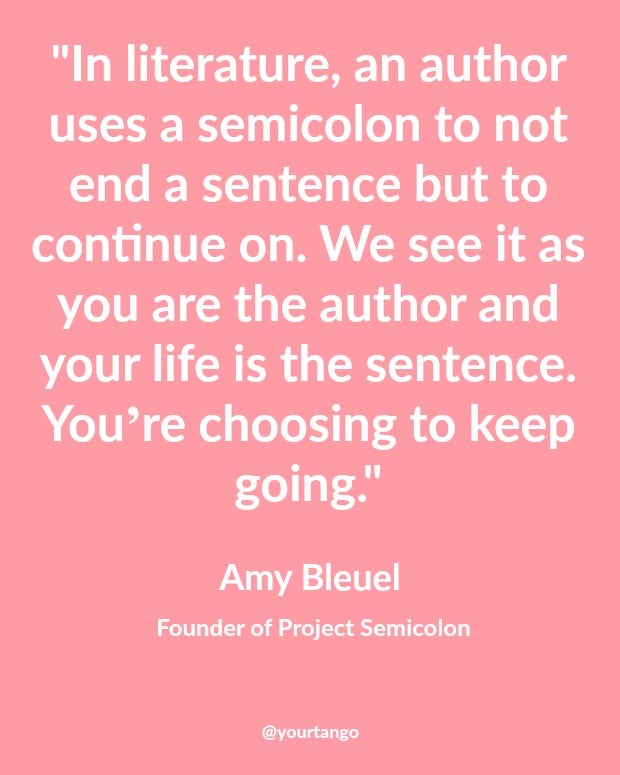 Shareably“In literature, an author uses a semicolon to not end a sentence but to continue on. We see it as you are the author and your life is the sentence. You’re choosing to keep going."
