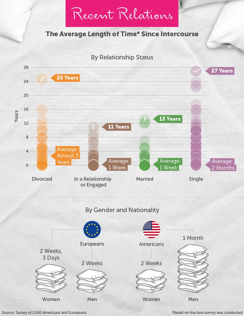 There was actually one person who went 27 years without having sex. Both European and American men and women went about two weeks on average without having sex, while American men were more often to go without sex for a month.