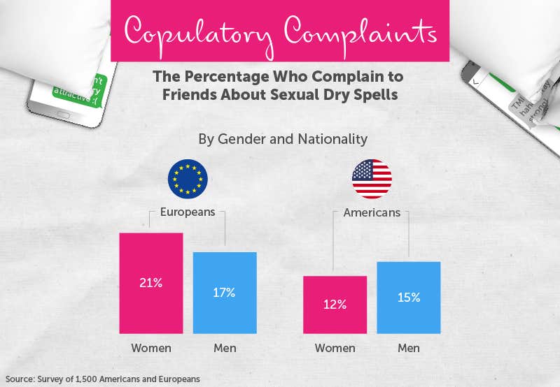 The study showed that 21 percent of European women shared their thoughts on a dry spell with friends while only 17 percent of European men complained about it to their friends. Americans were less likely to talk about it, with only 12 percent of women sharing with their friends and only 15 percent of men talking about it.