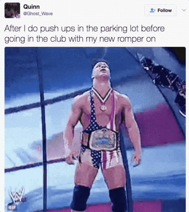 "After I do pushups in the parking lot before going in the club with my new romper on."