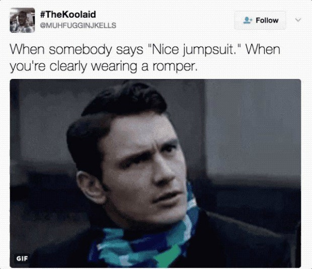 "When somebody says 'Nice jumpsuit,' when you're clearly wearing a romper."