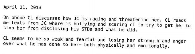 The notes state that she can't sleep through the night due to a fear that Carrey will "burst into her apartment and hurt her." She had nightmares that he is "raging at her."