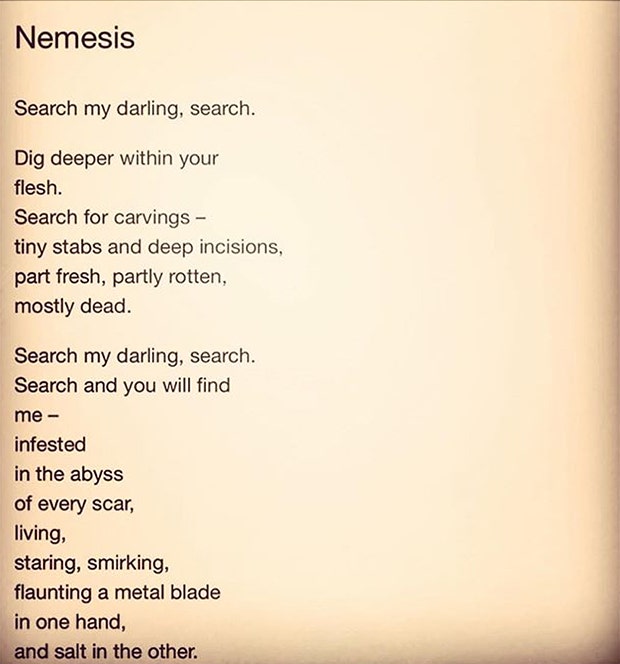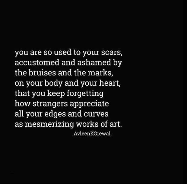 This poem shows scars as mesmerizing works of art rather than something to be ashamed of and hide under clothing or lies.
