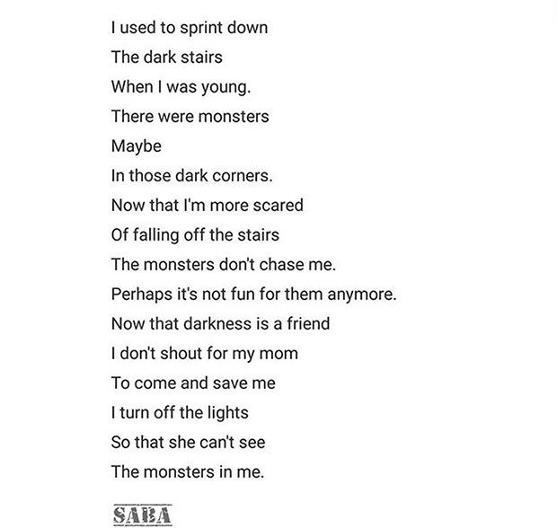 Saba’s poem deals with a similar theme and uses the images of shadows as well as monsters to convey the message. Naturally, it spoke to me on a psychological level even though the words themselves didn’t need to be elevated, which can detract from a poem in some cases.