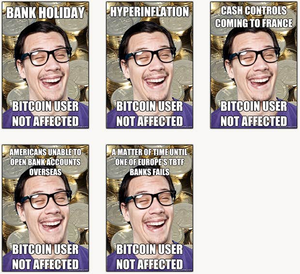 "Bank holiday, bitcoin user not affected. Hyperinflation, bitcoin user not affected. Cash controls coming to France, bitcoin user not affected. Americans unable to open bank accounts overseas, bitcoin user not affected. A matter of time until one of Europe's TBTF banks fails, bitcoin user not affected."
