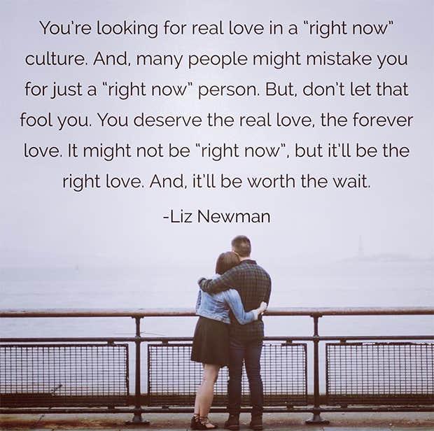 “You’re looking for real love in a ‘right now’ culture. And many people might mistake you for a ‘right now’ person. But don’t let that fool you. You deserve the real love, the forever love. It might not be ‘right now,’ but it’ll be the right love. And, it’ll be worth the wait.”—Liz Newman
