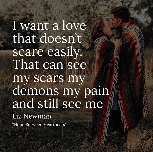 “I want a love that doesn’t scare easily. That can see my scars, my demons, my pain, and still see me.”—Liz Newman