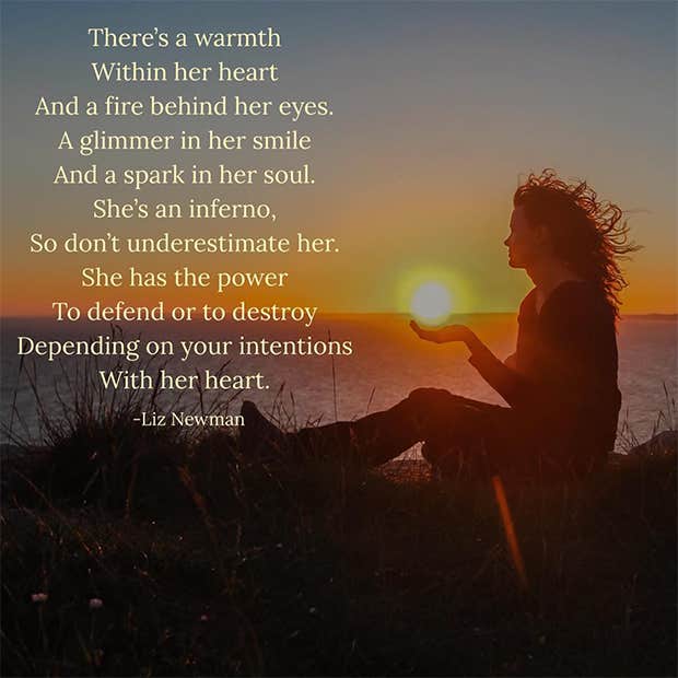 "There’s a warmth within her heart and a fire behind her eyes. A glimmer in her smile and a spark in her soul. She’s an inferno, so don’t underestimate her. She has the power to defend or to destroy, depending on your intentions with her heart.”—Liz Newman