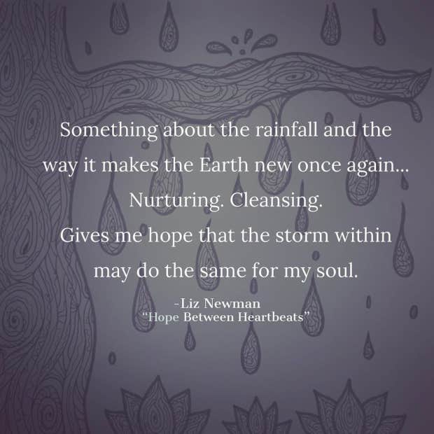 "Something about the rainfall and the way it makes the Earth new once again… nurturing, cleansing, gives me hope that the storm within may do the same for my soul.”—Liz Newman