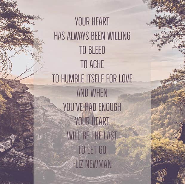 “Your heart has always been willing to bleed, to ache, to humble itself for love, and when you’ve had enough, your heart will be the last to let go.” —Liz Newman