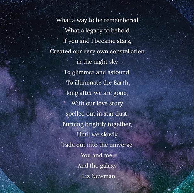 “What a way to be remembered, what a legacy to behold, if you and I became stars, created our very own constellation in the night sky. To glimmer and astound, to illuminate the Earth, long after we are gone, with our love story spelled out in star dust. Burning brightly together, until we slowly fade out into the universe, you and me, and the galaxy.”—Liz Newman