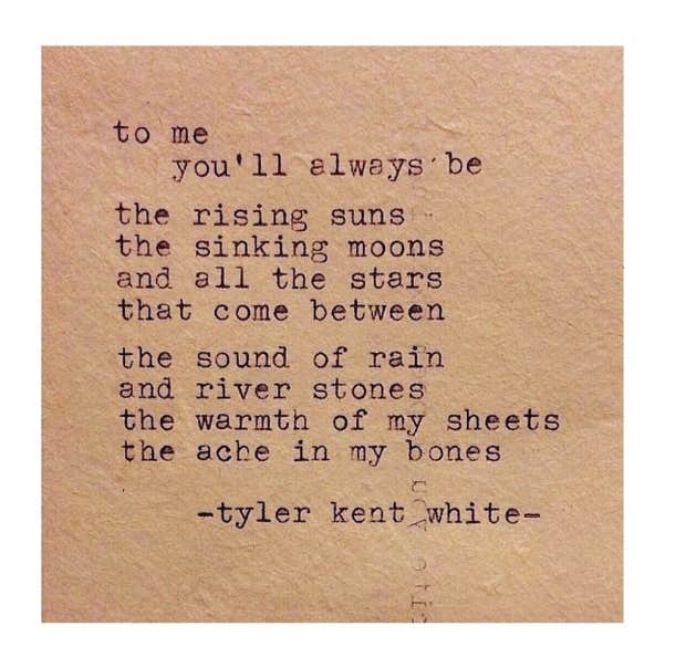 "To me, you’ll always be the rising suns, the sinking moons, and all the stars that come between the sound of rain and river stones, the warmth of my sheets, the ache in my bones.” – Tyler Kent White