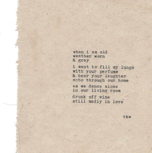 "When I am old, weather-worn, and grey, I want to fill my lungs with your perfume and hear your laughter echo through our home as we dance alone in our living room, drunk off wine, still madly in love.” – Tyler Kent White