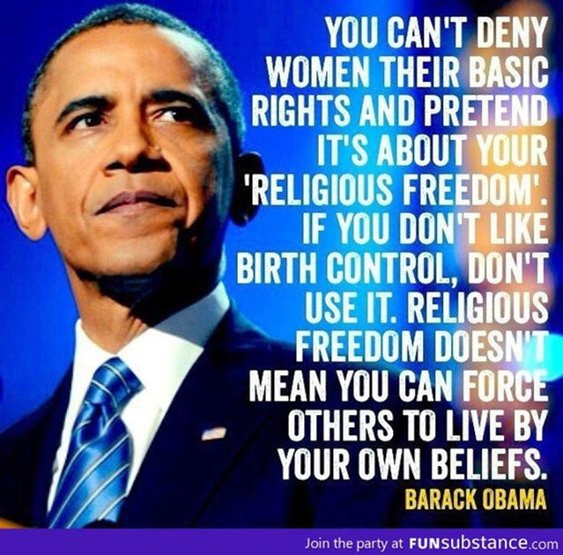 “You can’t deny women their basic rights and pretend it’s about your ‘religious freedom’. If you don’t like birth control, don’t use it. Religious freedom doesn’t mean that you can force others to live by your own beliefs. ” -Barack Obama