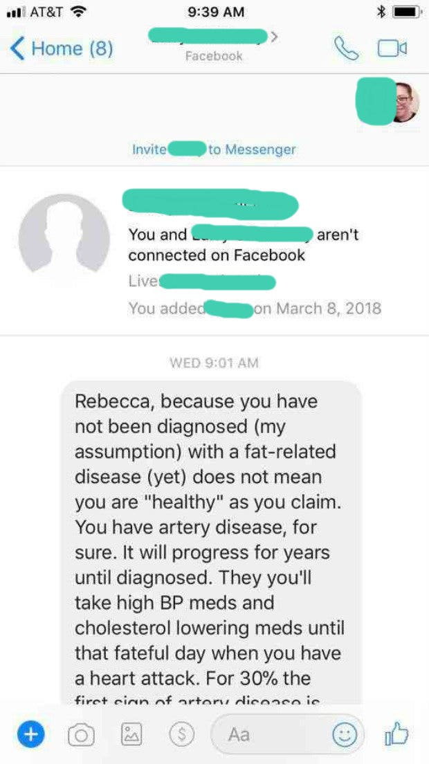 "My blood pressure, cholesterol, and heart are all really healthy. I eat a balanced diet and exercise regularly. I've weighed the same amount now as I did in my late teens. The fact that you read the story I shared on MSN and decided to come here under the pretense of concern for my well-being is laughable. This is a dummy account. You have no profile picture. You have six friends. You aren't worried about me. You don't know me. You made assumptions about me that are baseless. Concern trolling is a thing — you just did it. Now kindly --- right off."