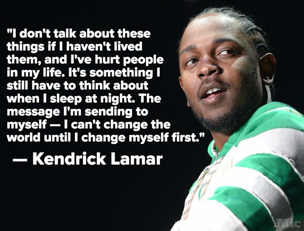 "I don't talk about these things if I haven't lived them, and I've hurt people in my life. It's something I still have to think about when I sleep at night. The message I'm sending to myself - I can't change the world until I change myself first."— Kendrick Lamar