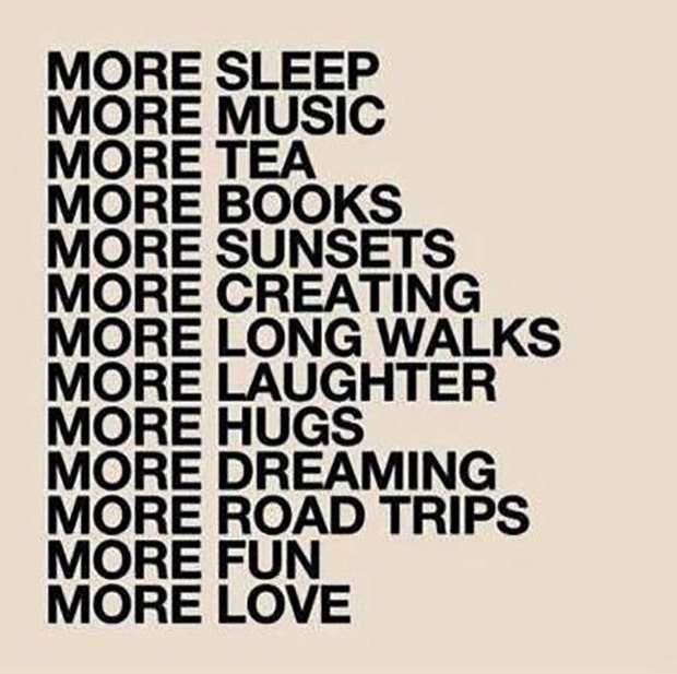 “More sleep, More music, More tea, More books, More sunsets, More creating, More long walks, More laughter, More hugs, More dreaming, More road trips, More fun, More love.”-Anonymous