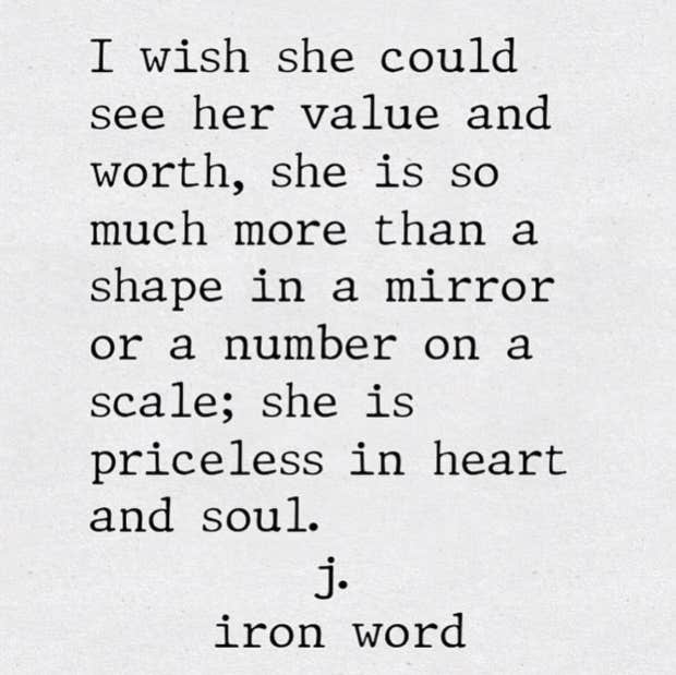 “I wish she could see her value and worth, she is so much more than a shape in a mirror or a number on a scale; she is priceless in heart and soul.”—J. Iron Word