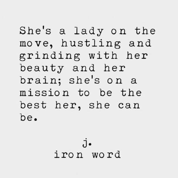 “She’s a lady on the move, hustling and grinding with her beauty and her brain; she’s on a mission to be the best her, she can be.”—J. Iron Word
