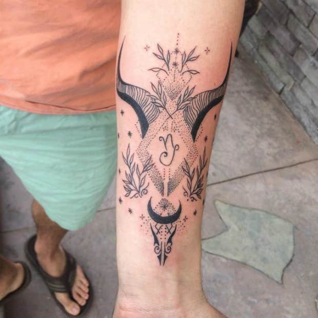 All you need for your Capricorn-inspired tattoo is the outline of a goat (or sea goat). After that, you can get as creative as you want, like this tattoo with an ornate design.