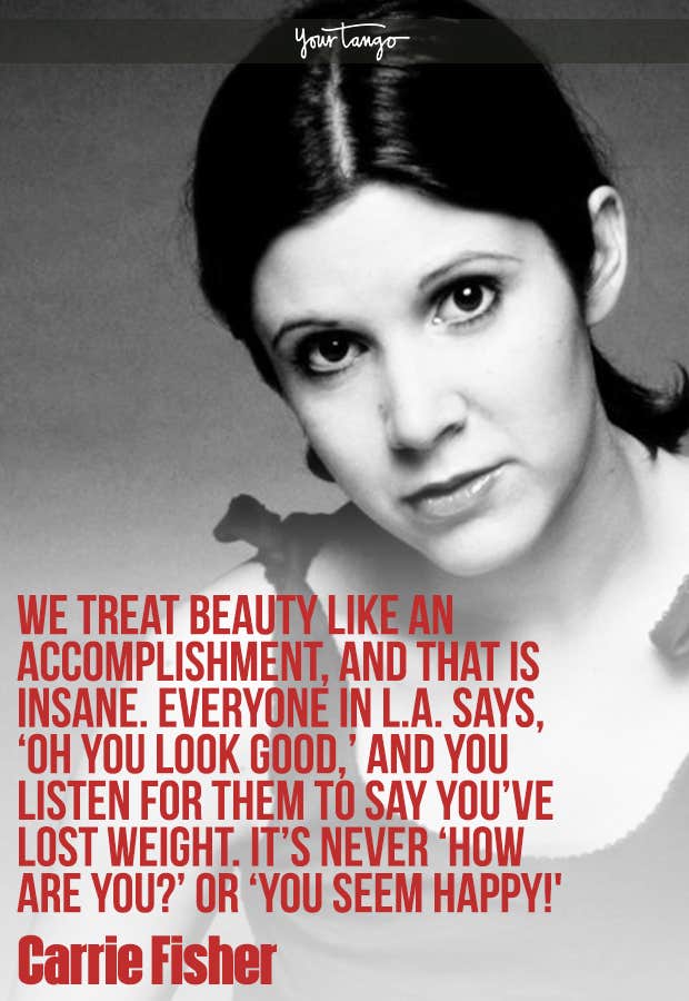 “We treat beauty like an accomplishment, and that is insane. Everyone in L.A. says, ‘Oh you look good,’ and you listen for them to say you’ve lost weight. It’s never ‘How are you?’ or ‘You seem happy!'”— Carrie Fisher