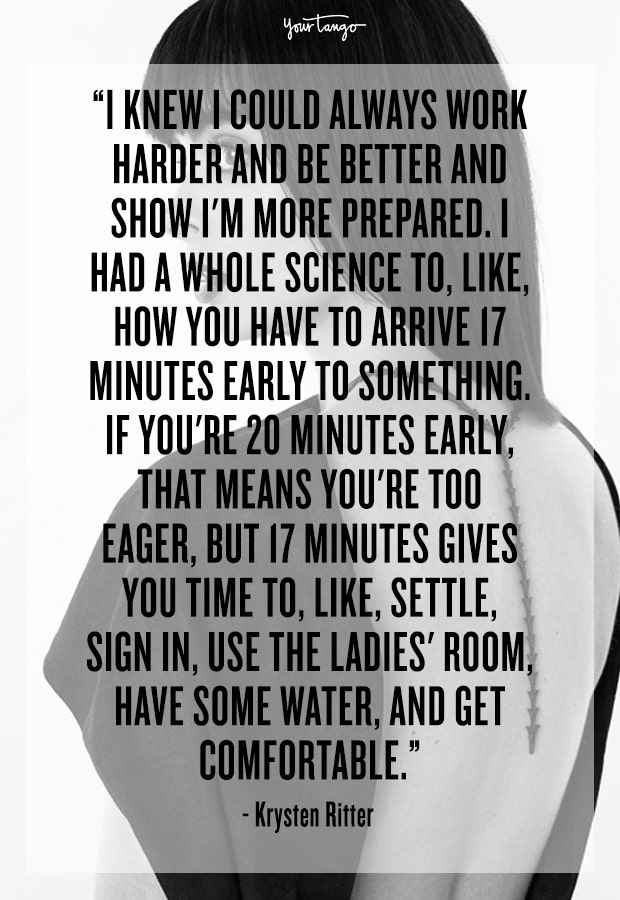 “I knew I could always work harder and be better and show I'm more prepared. I had a whole science to, like, how you have to arrive 17 minutes early to something. If you're 20 minutes early, that means you're too eager, but 17 minutes gives you time to, like, settle, sign in, use the ladies' room, have some water, and get comfortable.” — Krysten Ritter