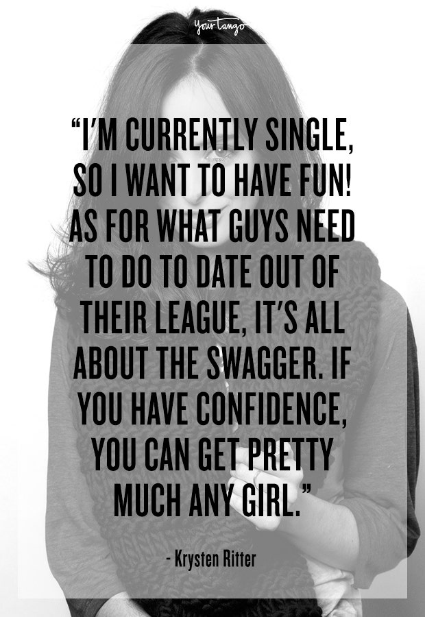 “I'm currently single, so I want to have fun! As for what guys need to do to date out of their league, it's all about the swagger. If you have confidence, you can get pretty much any girl.” — Krysten Ritter