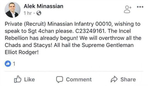 “Private (Recruit) Minassian Infantry 00010, wishing to speak to Sgt 4chan please. C23249161. The Incel Rebellion has already begun! We will overthrow all the Chads and Stacys! All hail the Supreme Gentleman Elliot Rodger!”