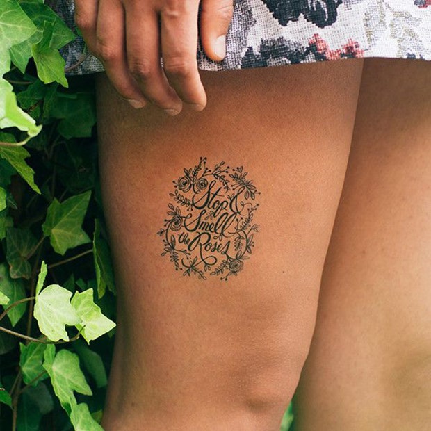 This tattoo reminds one to “stop and smell the roses” and is encircled by delicate and simple little roses.