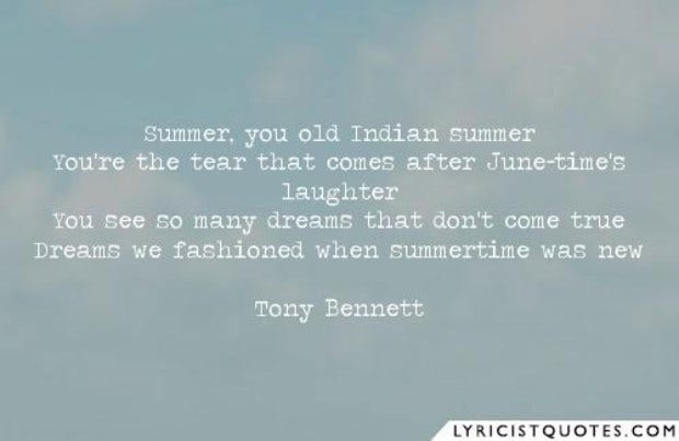 "Summer, you old Indian summer. You're the tear that comes after June-times laughter. You see so many dreams that don't come true. Dreams we fashioned when summertime was new" -Tony Bennett