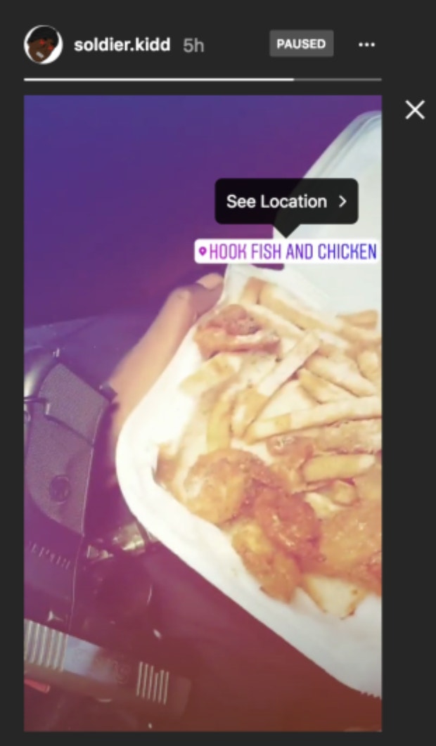 Before the shooting, Soldier Kidd posted a Boomerang video to his Instagram story showing that he had food from Hook Fish and Chicken, an eatery whose location, according to Google Maps, happens to be in Deerfield Beach, Florida — the same city where XXXTentacion was shot. Next to Kidd’s platter of food is a gun.