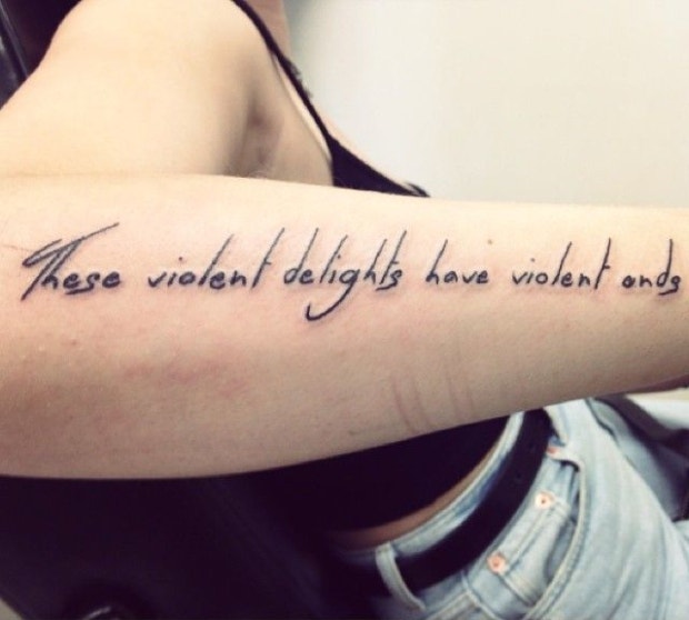 This tattoo has a very special memory behind it, one that Halsey uses to remind herself to take things slow in all she does. The singer told iHeartRadio News, "This one I got on Venice Beach right after I signed my record deal. It says 'These violent delights have violent ends.' This tattoo is a little heavy, and a little heavy to talk about, but I got it as a reminder to myself to sort of pace myself. Like violent delights having violent ends, it's a Shakespeare quote from Romeo and Juliet, which is incredibly cliché, but I'm a lover of literature so it makes sense for me. But pretty much what it means is anything you do violently, will end violently.