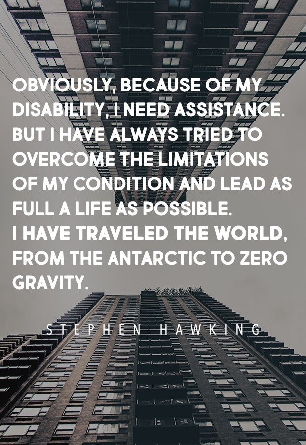 “Obviously, because of my disability, I need assistance. But I have always tried to overcome the limitations of my condition and lead as full a life as possible. I have traveled the world, from the Antarctic to zero gravity.”— Stephen Hawking