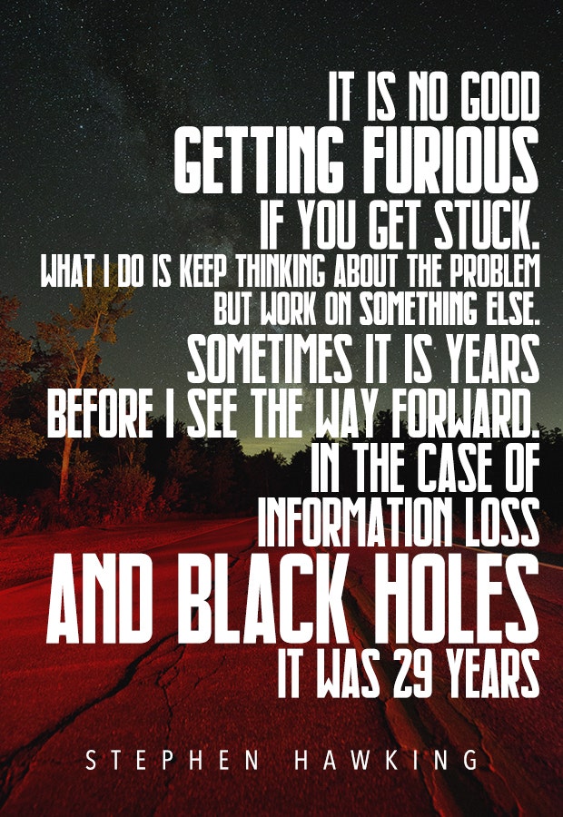 “It is no good getting furious if you get stuck. What I do is keep thinking about the problem but work on something else. Sometimes it is years before I see the way forward. In the case of information loss and black holes, it was 29 years.”— Stephen Hawking