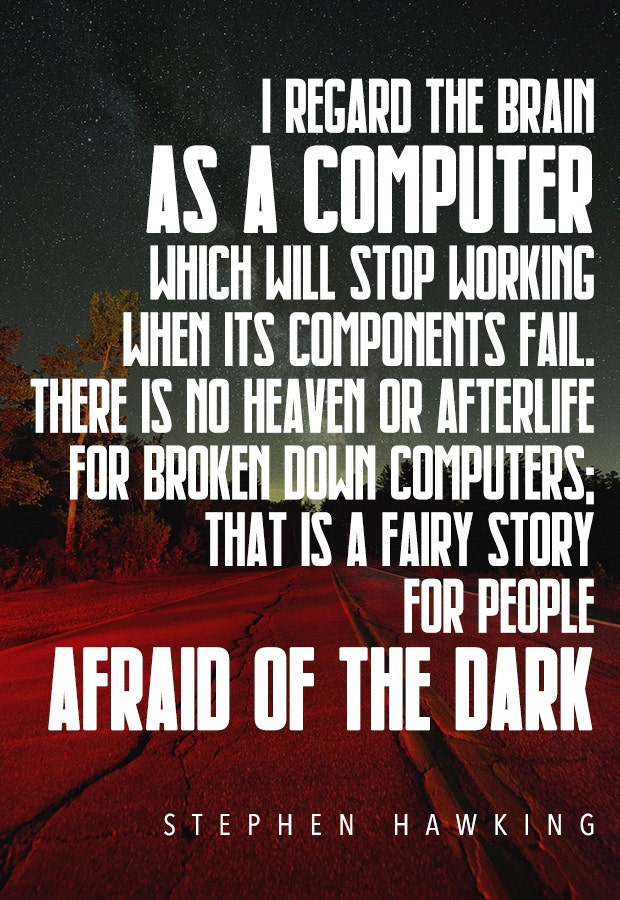 "I regard the brain as a computer which will stop working when its components fail. There is no heaven or afterlife for broken down computers; that is a fairy story for people afraid of the dark."— Stephen Hawking