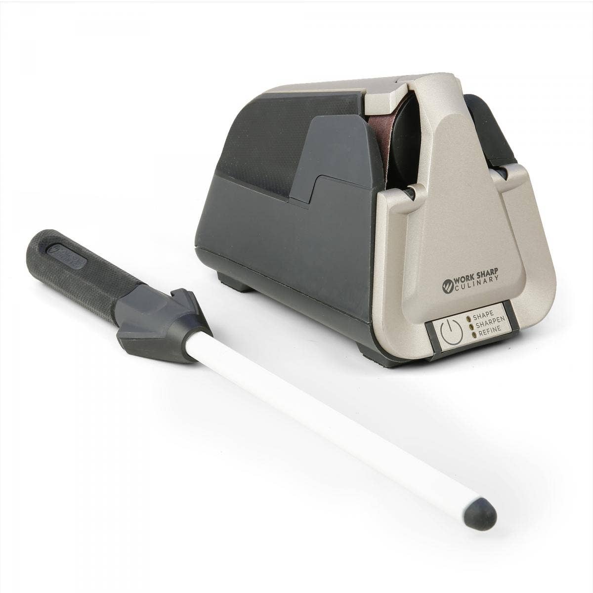 A good sharpener can make them like new again, and make anyone feel like a kitchen hero in the process. That's why Work Sharp Culinary created the Work Sharp E5 Electric Kitchen Knife Sharpener — a sleek, user-friendly, long-lasting knife sharpener that turns any knife into your “good” knife. The E5 is the only knife sharpener on the market that uses flexible abrasive belts — the same technology that Shun and Henckels use to craft their knives.