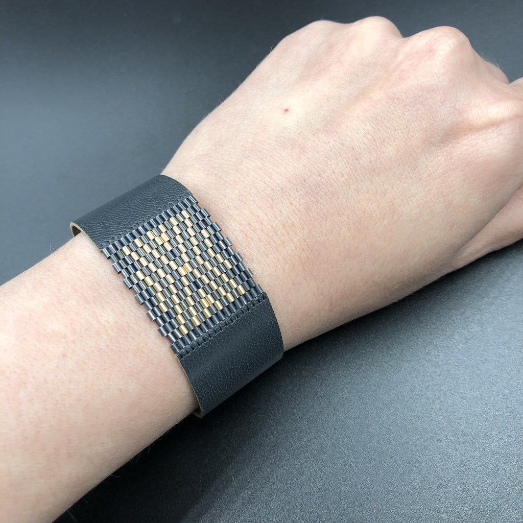 Micro hand-beaded sterling silver and 14k gold chevron pattern inlay stitched to premium Ash colored leather. The design is just over 1" wide, with a custom sterling silver hook and bar closure set with tiny double cap rivets. Handmade in Paonia, CO using the highest quality materials available and all sourced in the USA.