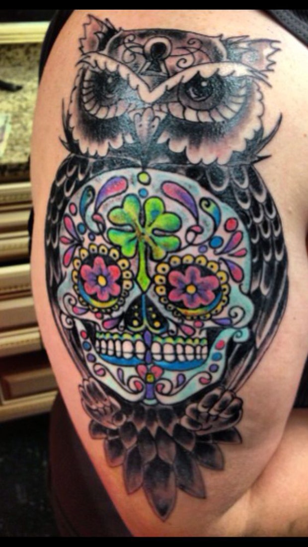 40. This sugar skull tattoo is featured on the breast of an owl.