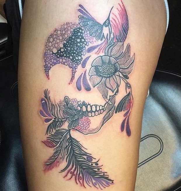 25. Feather tattoos are pretty popular. Make yours unique by incorporating a sugar skull.