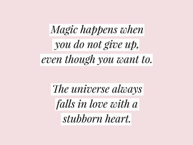"Magic happens when you do not give up, even though you want to. The universe falls in love with a stubborn heart."—Unknown