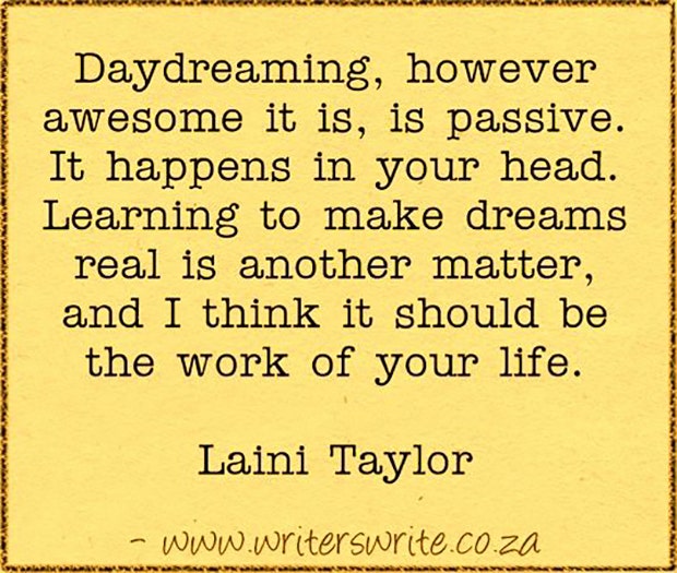 "Daydreamer, however awesome it is, is passive. It happens in your head. Learning to make dreams real is another matter, and I think it should be the work of your life."— Laini Taylor
