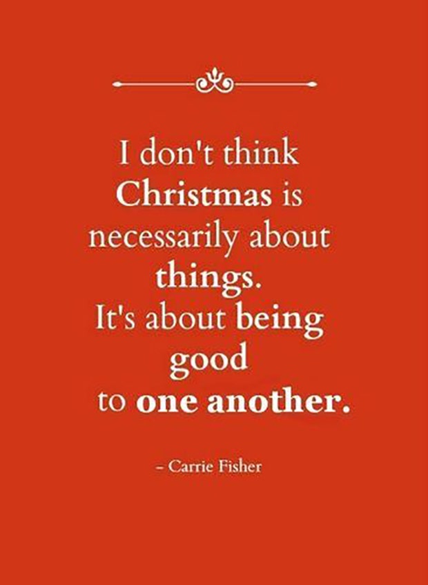 "I don't think Christmas is necessarily about things. It's about being good to one another."— Carrie Fisher