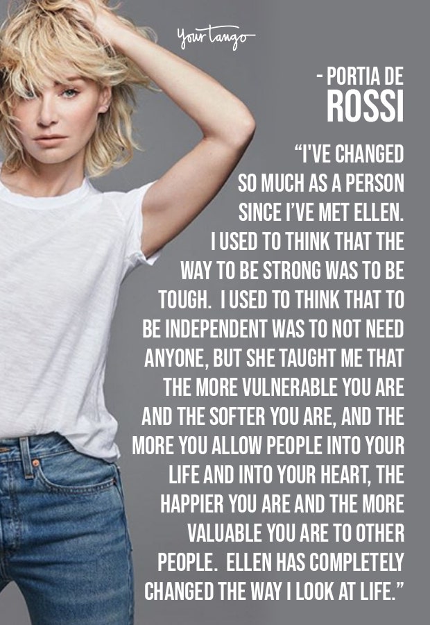 "I've changed so much as a person since I've met Ellen. I used to think that the way to be strong was to be tough. I used to think that to be independent was to not need anyone, but she's taught me that the more vulnerable you are and the softer you are, and the more you allow people into your life and into your heart, the happier you are and the more valuable you are to other people. Ellen has completely changed the way I look at life," — Portia de Rossi
